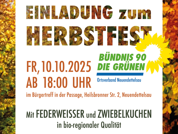Am Freitag, 10. Oktober 2025 veranstaltet der Ortsverband Neuendettelsau von BÜNDNIS 90 / DIE GRÜNEN ihr Herbstfest mit Federweißer und Zwiebelkuchen in bio-regionaler Qualität. Der Herbst ist da – und wir möchten ihn gerne gemeinsam mit Euch feiern! Dazu laden wir herzlich zu…