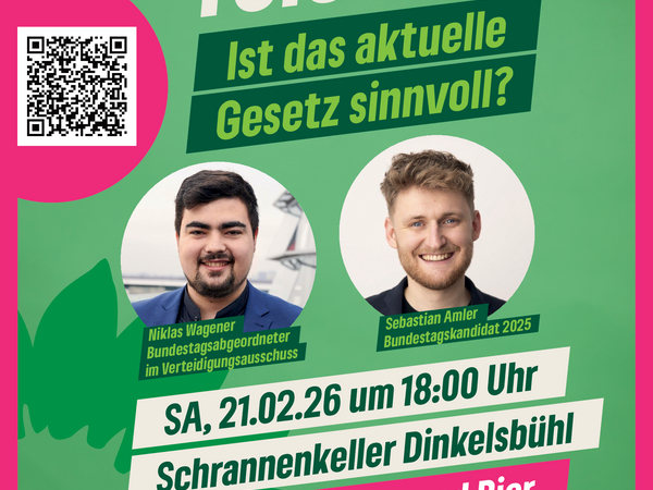 Wehrpflicht Reloaded? - Sicherheit für Alle oder Freiheits-Diebstahl? Wir holen das Thema raus aus dem Bundestag und reden in Dinkelsbühl vor Ort drüber mit dem Bundestagsabgeordneten Niklas Wagener! Du hast Lust auf ein Stück Pizza, Bier und gute Gespräche, dann komm am 21.…