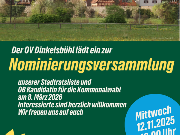 Bündnis 90/Die Grünen Dinkelsbühl laden zur Mitgestaltung ein Am Mittwoch, den 12. November 2025, um 19:00 Uhr, findet im Gasthaus Weib’s Brauhaus (Untere Schmiedgasse 13, Dinkelsbühl) die Nominierungsversammlung des Ortsverbandes Bündnis 90/Die Grünen statt. Im Mittelpunkt…