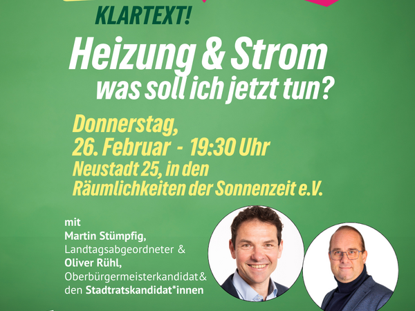 KLARTEXT! Heizung & Strom - Was soll ich jetzt tun? Donnerstag, 26. Februar, 19:30 Uhr Neustadt 25 (Fussgängerzone), in den Räumlichkeiten der Sonnenzeit e.V. mit Martin Stümpfig, Landtagsabgeordneter und Oliver Rühl, Oberbürgermeisterkandidat, sowie den…