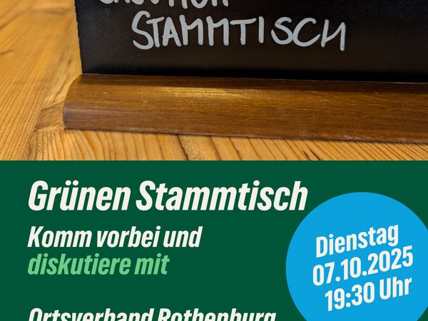 Komm vorbei zum Grünen Stammtisch des Ortsverbands Rothenburg. Lerne uns und aktive Grüne kennen, bring dich ein und diskutiere mit. Wir freuen uns auf Dich.