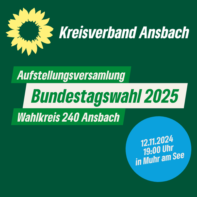 Im Frühjahr 2025 findet die nächste Bundestagswahl statt (statt wie geplant 28. September 2025). Hierfür werden wir Grüne aus den Kreisverbänden Ansbach und Weißenburg-Gunzenhausen für den Wahlkreis Ansbach eine*n Direktkandidat*in für die Bewerbung auf einen Platz der bayerischen Landesliste wählen.