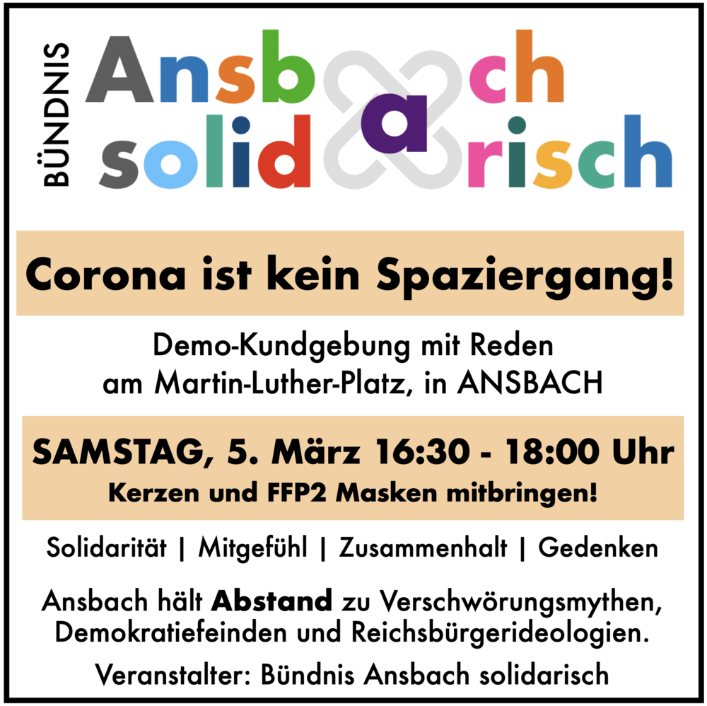 Wir laden herzlich ein zur Demo-Kundgebung am 5. März um 16:30 Uhr am Martin-Luther-Platz in #Ansbach: