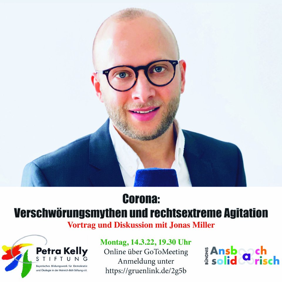 VerschwörungsideologIinnen, radikale ImpfgegnerInnen, Staatsfeinde und Rechtsextreme nutzen die Coronakrise, um Stimmung gegen die Demokratie zu machen. Skurrile Theorien zum Virus – auch antisemitische – scheinen ihnen dafür ein willkommenes Werkzeug zu sein. Auch in Bayern werden diese Verschwörungserzählungen weiterverbreitet, an Demonstrationen nahmen mehrere tausend Menschen teil. Auch in Ansbach ist die heterogene Szene aktiv. Der Vortrag von Jonas Miller skizziert wie sich die Szene vernetzt, welche Inhalte verbreitet werden und wie unter anderem Rechtsextreme versuchen, diese Stimmung zu nutzen.
