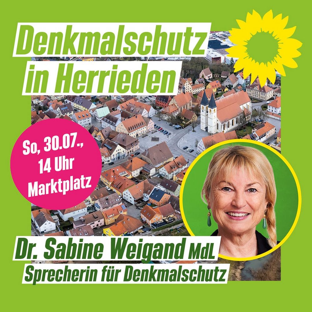 Herrieden. „Denkmäler erhalten – Klima retten und Altstadt beleben!“ Moderner Denkmalschutz passt sich den Gegebenheiten an und bremst nicht. Unter diesem Motto begehen wir am 30. Juli 2023 gemeinsam mit MdL Dr. Sabine Weigand, Sprecherin für Denkmalschutz im Bayerischen Landtag, unsere historische Altstadt. Los geht es um 14 Uhr am Marktplatz in Herrieden. Im Rahmen des Stadtspaziergangs wollen wir uns über aktuelle Herausforderung wie zum Beispiel Leerstandaktivierung, Verkehrsberuhigung sowie den Ausbau Erneuerbarer Energien im Einklang mit dem Denkmalschutz austauschen. Mit dabei ist auch unsere Bezirkstagkandidatin Lisa Renz-Hübner, die sich unter anderem für das Thema Kultur im ländlichen Raum stark macht. Wir freuen uns auf euer Kommen!