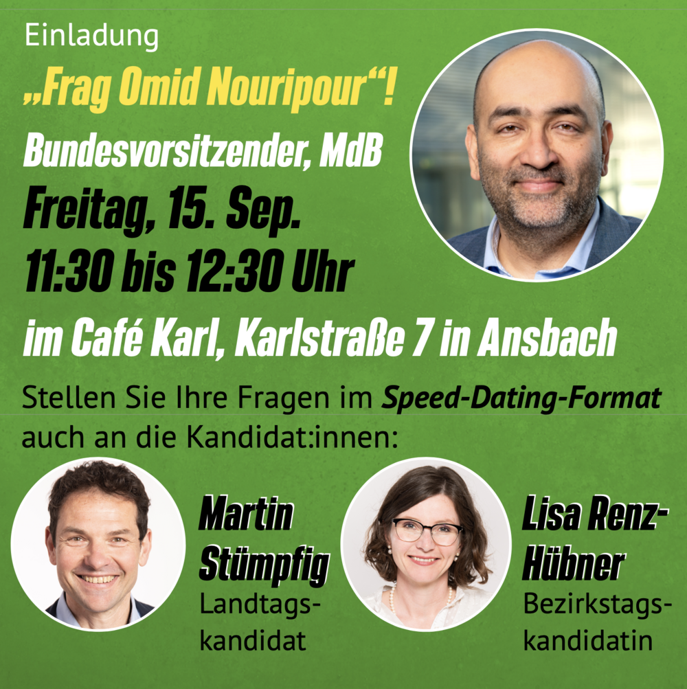 Wir laden Sie, die Bürgerinnen und Bürger ein zum Speed-Dating mit Omid Nouripour (MdB), sowie Martin Stümpfig (Landtagskandidat) und Lisa Renz-Hübner (Bezirkstagskandidaten).