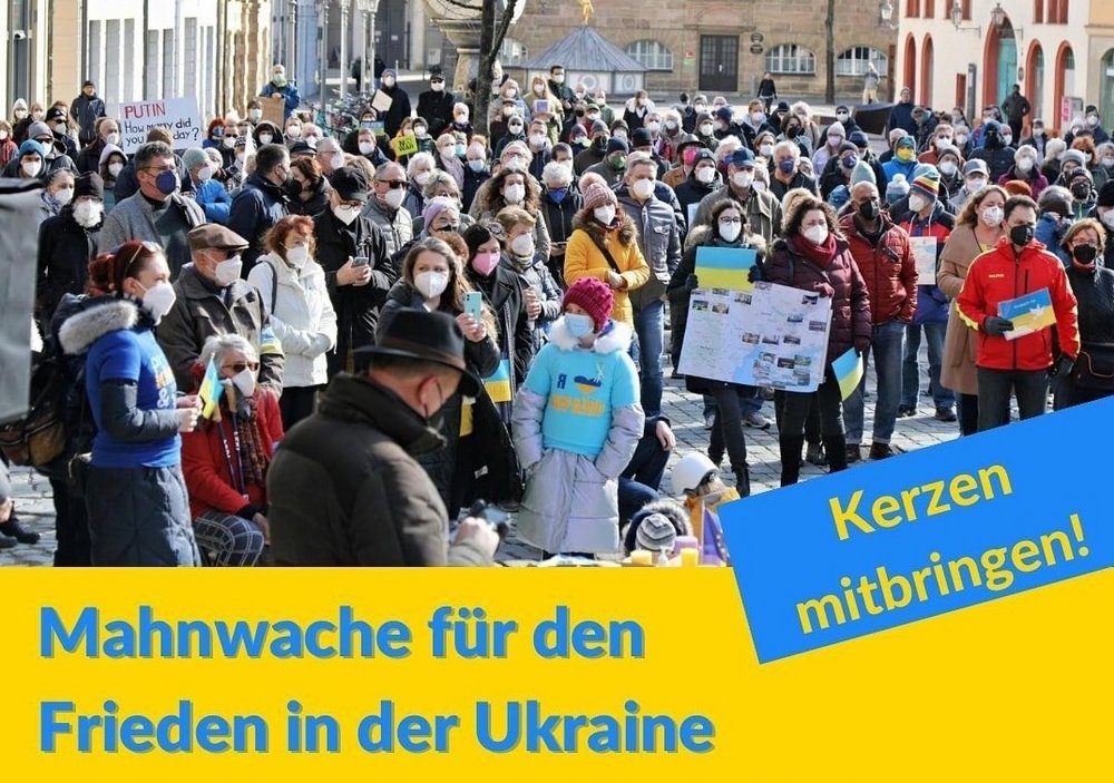 Dort ist ab 17:00 Uhr eine Mahnwache, initiiert von Meike Erbguth-Feldner, Tobias Gaisser und Bernhard Schmid, gemeinsam mit der Bürgerbewegung für Menschenwürde in Mittelfranken und dem Hilfsverein Ukraine Ansbach International.