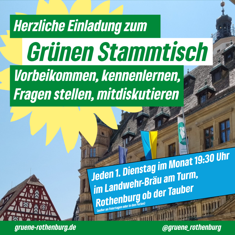 Rothenburg ob der Tauber. Willkommen zum Grünen Stammtisch, jeden 1. Dienstag im Monat im Landwehr-Bräu am Turm, ab 19:30 Uhr.