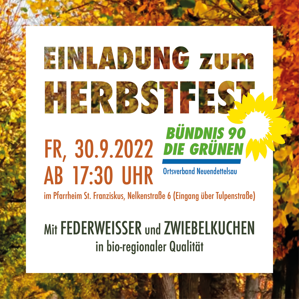 Am Freitag, 30. Sept. 2022 veranstaltet der Ortsverband Neuendettelsau von BÜNDNIS 90 / DIE GRÜNEN ihr Herbstfest mit Federweißer und Zwiebelkuchen in bio-regionaler Qualität.