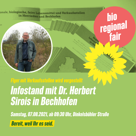 Der Flyer, den die Arbeitsgruppe Bio-Regional-Fair des Ortsverbands erstellt hat, sowie ein Saisoneinkaufskalender sind erhältlich am Infostand, zu dem die Bevölkerung ab 09:30 Uhr in die Dinkelsbühler Straße, Nähe Kreisverkehr, herzlich eingeladen ist. Mitglieder des Ortsverbandes Miteinander GRÜN Herrieden-Bechhofen und als Gast Direktkandidat Dr. Herbert Sirois informieren außerdem über Themen zur Bundestagswahl. Im Anschluss, gegen 12 Uhr, soll die Veranstaltung am Krummweiher in Königshofen mit einem gemütlichen Zusammensein ausklingen.
