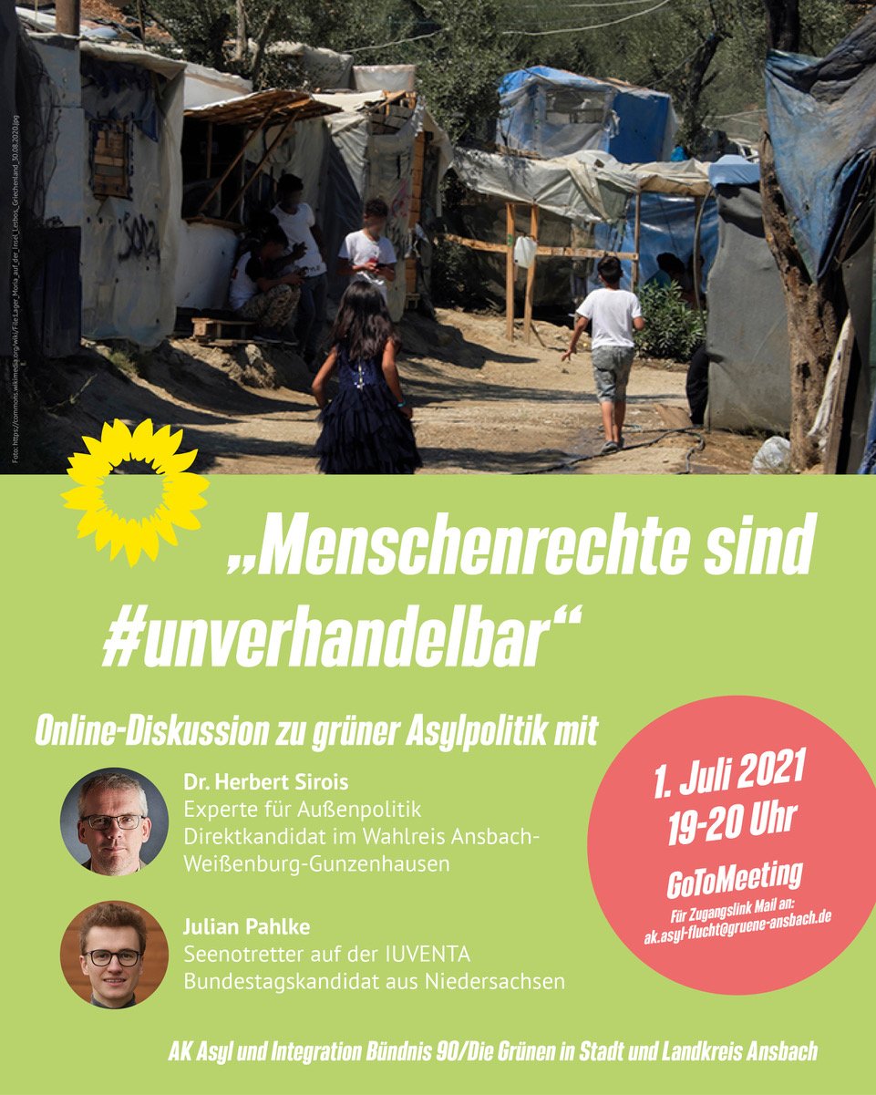 Donnerstag, 1. Juli von 19 bis 20 Uhr zur Online – Veranstaltung „Menschenrechte sind #unverhandelbar“ ein. Dr. Herbert Sirois (Bundestagsdirektkandidat) und Julian Pahlke (Seenotretter und Kandidat für den Bundestag) diskutieren über grüne Vorschläge zur Asyl – und Integrationspolitik. Außerdem wird Julian Pahlke von seinen eigenen Erfahrungen bezüglich der Menschenrechtslage an den EU-Außengrenzen berichten. Abschließend besteht die Möglichkeit zum Austausch über die Bewegung „Sichere Häfen“ in unserer Region.
