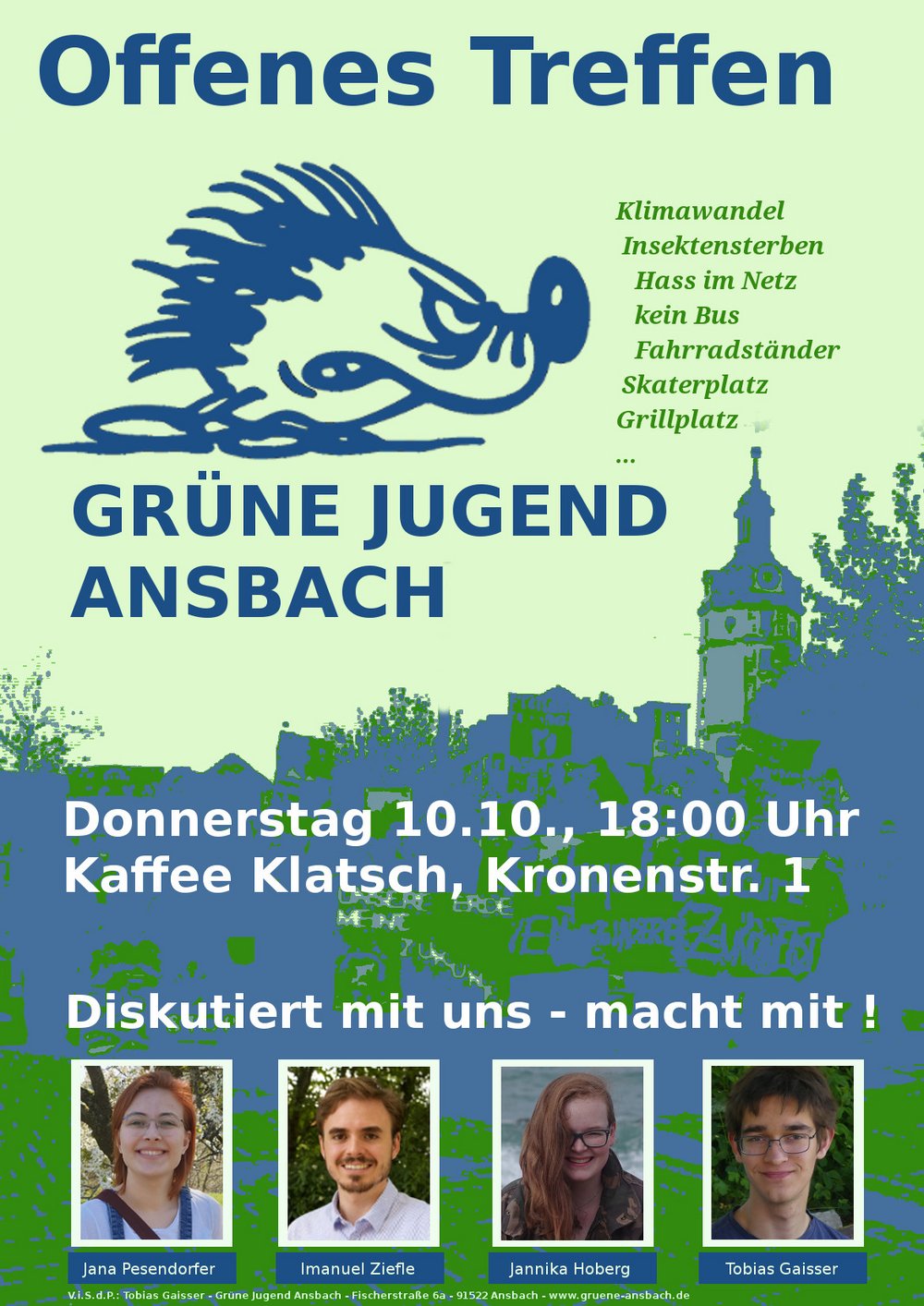 Am Donnerstag 10. Oktober trifft sich die Ansbacher Grüne Jugend im Kaffee Klatsch, Kronenstraße 4 in Ansbach.