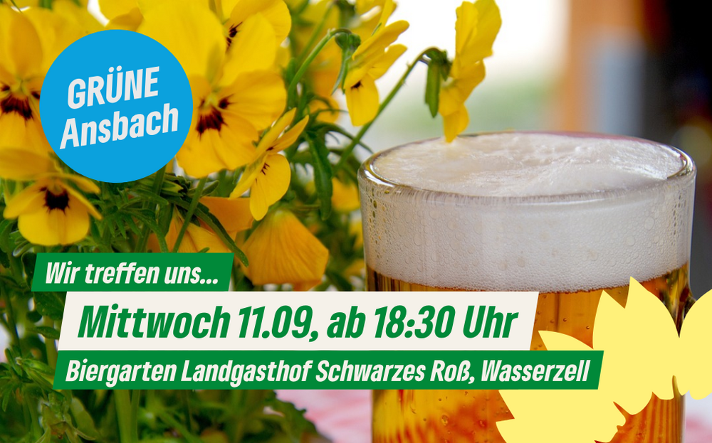 Ansbach/Ortsverband. Das Ortsverbandstreffen der Ansbacher Grünen findet Mittwoch 11.09.2024, 18:30 Uhr im Biergarten des Landgasthof Schwarzes Roß, Wasserzell statt.
