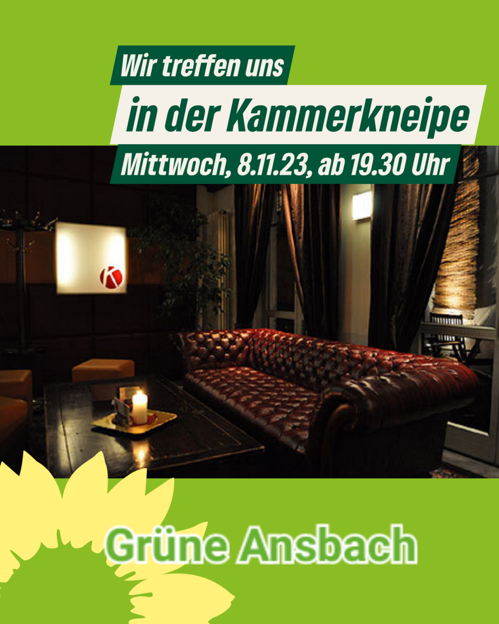 Ansbach/Ortsverband. Das Ortsverbandstreffen der Ansbacher Grünen findet am Mittwoch, 8.11.2023, ab 19:30 Uhr in der Kneipe der Kammerspiele, Maximilianstr. 27 in Ansbach, statt.