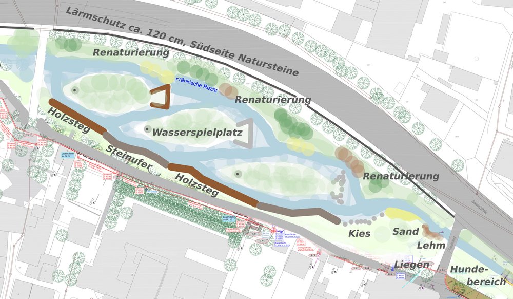 Wo genau Spielbereiche, Uferstege, Liegebänke und eine Ḱneipp-Anlageplatziert werden könnten, müsste mit allen Akteuren abgeklärt werden. Die Visualisierung auf der Grundlage des Plans zum Hochwasserschutz (Urheber Wasserwirtschaftsamt Ansbach, verändert) ist da nur ein Vorschlag.