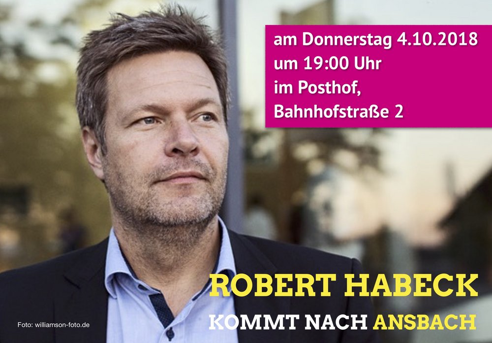 unser Bundesvorsitzender Robert Habeck von BÜNDNIS 90/DIE GRÜNEN kommt am Donnerstag, den 04.10.2018, im Rahmen seiner Bayern-Tour nach Ansbach. Unter dem Motto „Robert Habeck im Gespräch" können Sie direkt mit ihm reden. Ihn interessiert, was sie bewegt.