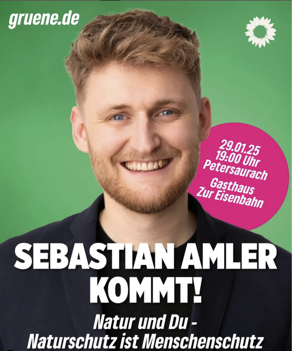 Unsere Bundestagskandidat Sebastian Amler kommt am 29.01.25 um 19 Uhr ns Gasthais zur Eisenbahn nach Petersaurach. Sie und ihr seid herzlich eingeladen. Der Titel der Veranstaltung lautet: Natur und Du - Naturschutz ist Menschenschutz.