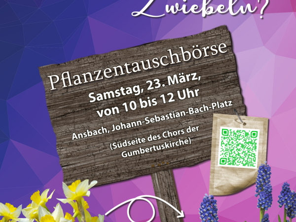 Abgeben und/oder Abholen: Pflanzentauschbörse für alle Interessierten, die von Pflanzen, Knollen, Stauden, Zwiebeln zu viel haben oder irgendwo eine Lücke füllen wollen: während der Marktzeit in Ansbach am Samstag, dem 23. März, von 10 bis 12 Uhr am…