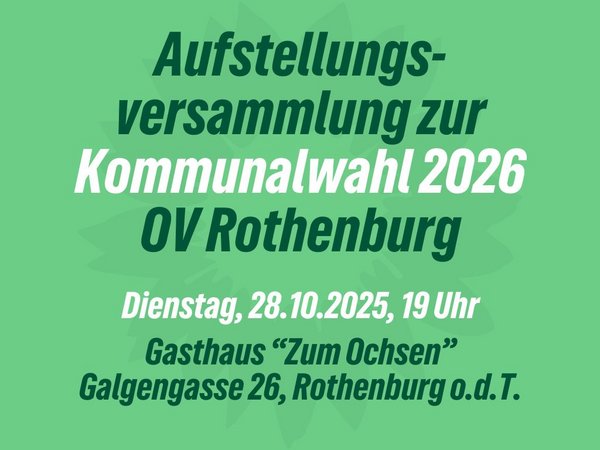 Aufstellungsversammlung zur Kommunalwahl im OV Rothenburg Was: Aufstellungsversammlung zur Kommunalwahl im OV Rothenburg Wann: Dienstag, 28.10.2025, 18/19 Uhr Wo: Gasthaus "Zum Ochsen", Galgengasse 26, 91541 Rothenburg ob der Tauber. Weitere Details und Informationen zur…