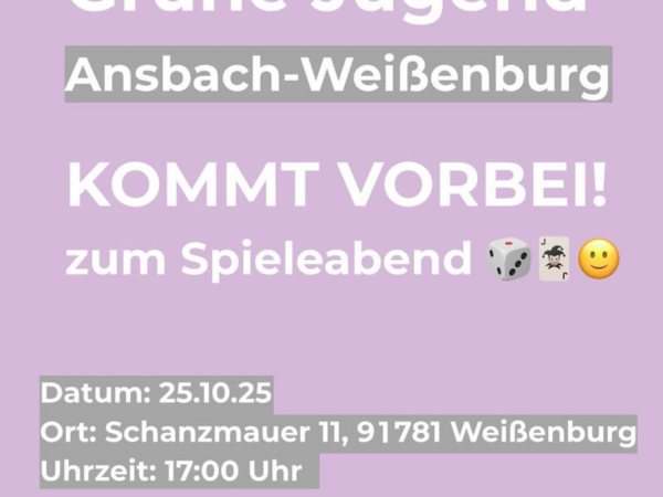 Spieleabend der Grünen Jugend Ansbach/WUG in Weißenburg Die Grüne Jugend Ansbach/WUG lädt am Samstag den 25.10 um 17:00 zum Spieleabend ein. So kann man sich in einer spaßigen Runde mit anderen jungen Grünen connecten. Bring ruhig deine Lieblingsspiel mit :) Die Jugend…