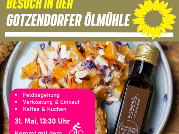 Wir besuchen die Ölmühle in Gotzendorf und beginnen mit einer Feldbegehung. Anschließend lernen wir die Mühle kennen, können Öle und andere Produkte verkosten und im Hofladen kaufen. Bei Kaffee und Kuchen beenden wir die Veranstaltung nach ca. 2 Stunden. Kommt gerne mit dem…