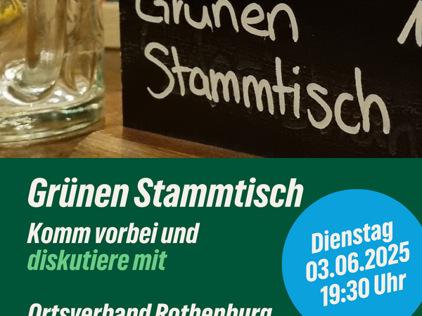 Komm vorbei zum Grünen Stammtisch des Ortsverbands Rothenburg. Lerne uns und aktive Grüne kennen, bring dich ein und diskutiere mit. Wir freuen uns auf Dich.