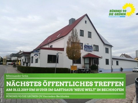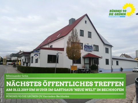 Am Sonntag, den 1. Dezember 2019, lädt der im neu gegründete GRÜNE Ortsverband Herrieden-Bechhofen zu seinem dritten öffentlichen Treffen nach Bechhofen ein. Getreu dem Motto „Mitreden, Mitentscheiden, Mitmachen“ ist die Bevölkerung des Marktes Bechhofen angesprochen, teilzunehmen und sich über die Gestaltung einer lebenswerten Zukunft auszutauschen. Zudem wird eine Ausstellung über Elektromobilität von INKOTA zu sehen sein.