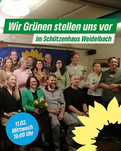 Am Mittwoch, 11.02.26, sind wir um 19:00 Uhr im Schützenhaus Weidelbach und stellen uns vor – um zuzuhören, zu diskutieren und gemeinsam zu überlegen, wie wir unsere Region noch lebenswerter machen. Ob Klimaschutz, bezahlbares Wohnen oder starke Gemeinden: Wir wollen wissen, was dir wichtig ist.