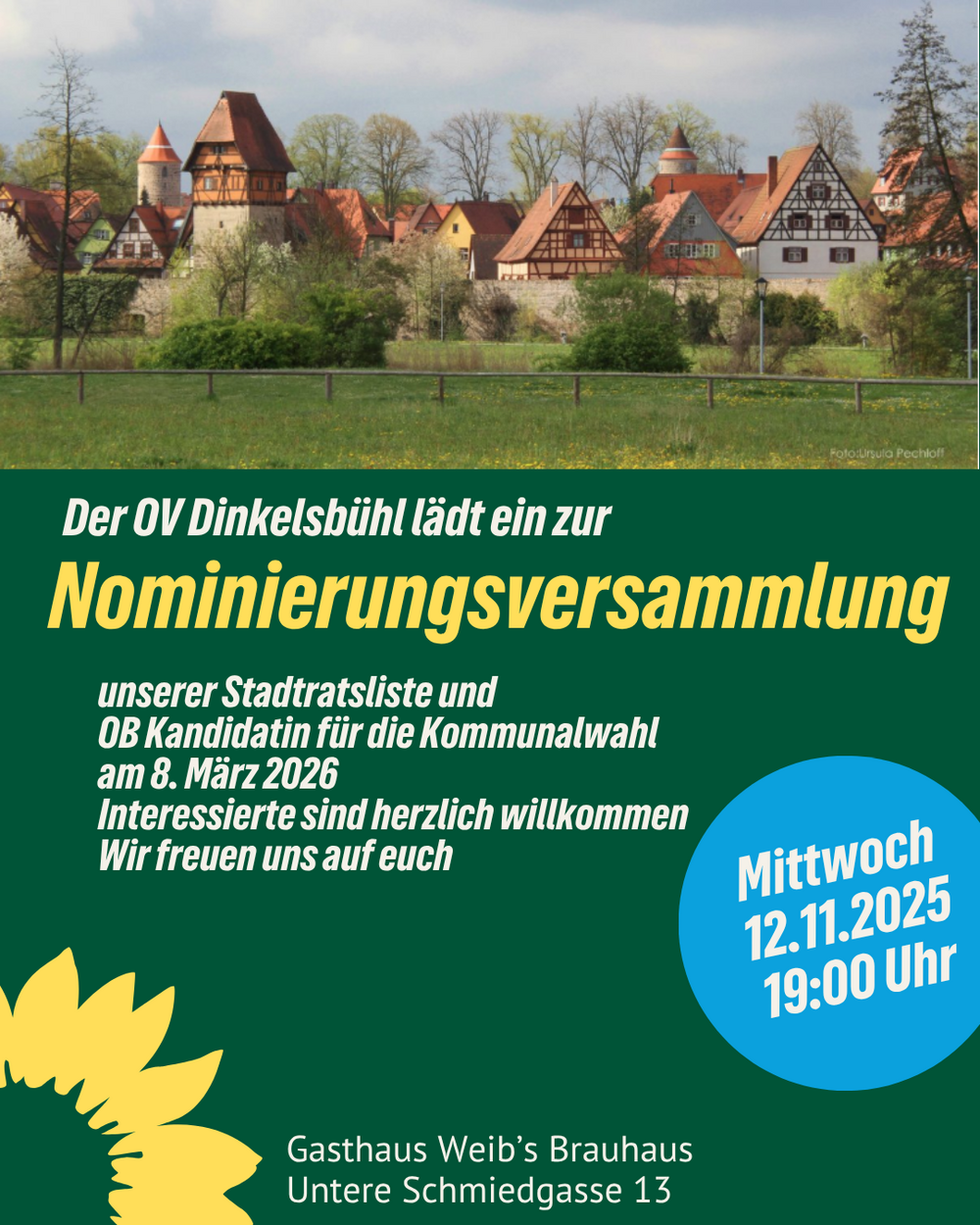 Am Mittwoch, den 12. November 2025, um 19:00 Uhr, findet im Gasthaus Weib’s Brauhaus (Untere Schmiedgasse 13, Dinkelsbühl) die Nominierungsversammlung des Ortsverbandes Bündnis 90/Die Grünen statt. Im Mittelpunkt stehen die Aufstellung der Stadtratsliste sowie die Benennung der Kandidatin für das Amt der Oberbürgermeisterin zur Kommunalwahl am 8. März 2026.