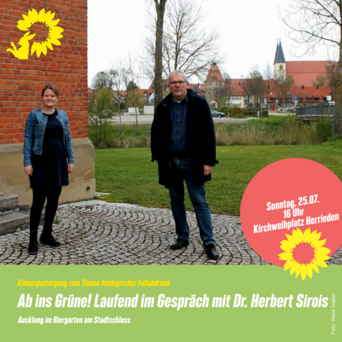Herrieden. Am Sonntag, 25.07.21, war unser Direktkandidat zur Bundestagswahl, Dr. Herbert Sirois, für einen Klimaspaziergang in Herrieden zu Gast. Gestartet sind wir am Kirchweihplatz. Von dort führte der etwa einstündige gemeinsamer Spaziergang durch das Herrieder Stadtgebiet. Mit dem Format „Laufend im Gespräch“ zu Themen flächensparende Siedlungsentwicklung, Verkehrswende und die Belebung des Stadtschlosses. Der Ausklang erfolgte im Biergarten am Stadtschloss.