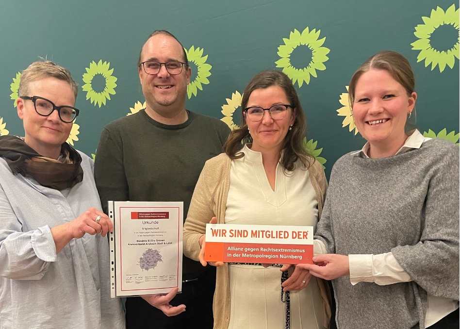 Ansbach/Kreisverband. Als klares Bekenntnis zu unserer freiheitlich-demokratischen Grundordnung ist der Kreisverband der Grünen Ansbach Stadt und Land der „Allianz gegen Rechtsextremismus in der Metropolregion Nürnberg“ beigetreten. Der überparteiliche Zusammenschluss von Kommunen, Landkreisen und zivilgesellschaftlichen Organisationen setzt sich gegen jede Form gruppenbezogener Menschenfeindlichkeit ein, insbesondere Rassismus, Antisemitismus und Demokratiefeindlichkeit.