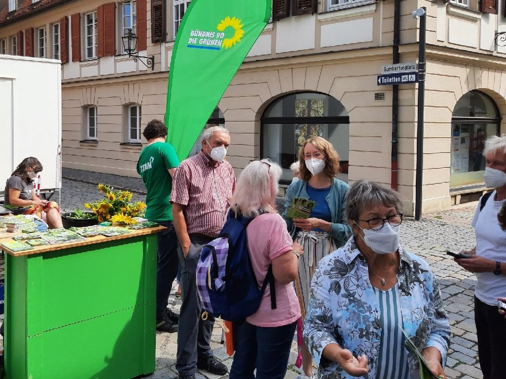 Bei bestem Sommerwetter, Brezeln und Bionade kam es zu einem regen Gedankenaustausch, auch mit Verteter:innen anderer Parteien. Nach einem Mittagessen im Mohren mit den örtlichen Grünen ging es für Eva Lettenbauer weiter zum Grünen Sommerfest in Dinkelsbühl.