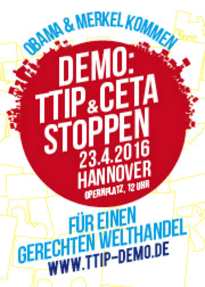 Dagegen tragen wir unseren Protest auf die Straße! Getragen von einem breiten Bündnis demonstrieren wir mit zehntausenden Menschen am Samstag, den 23. April in Hannover - unmittelbar vor dem Besuch Obamas.