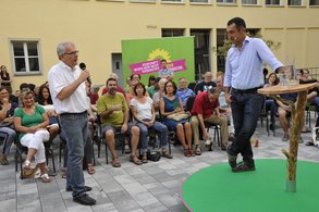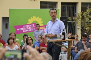 Cem Özdemir, Spitzenkandidat von BÜNDNIS 90/DIE GRÜNEN zur Bundestagswahl, war am Mittwoch den 30.08.2017 im Rahmen einer bundesweiten „Zukunft wird aus Mut gemacht“-Tour in Ansbach. Zu der Veranstaltung waren über 200 Bürgerinnen und Bürgern in den Posthof gekommen um Cem Özdemir eigene Fragen zu stellen. Die Fragen konnten die Gäste des Abends auf vorgefertigte Zettel schreiben, die dann von Mitgliedern und Freunden des Kreisverbands eingesammelt wurden. Moderiert wurde das Gespräch von Dr. Herbert Sirois, unserem Direktkandidat zur Bundestagswahl. Cem Özdemir beantwortete über 70 Minuten Fragen aus dem Publikum und nach der Veranstaltung, stand er noch für Fotos zur Verfügung.