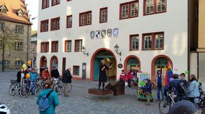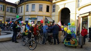 Hebt zum Schluss eure Luftballons noch mal hoch! Eure Hände hoch! Wir sind für eine Miteinanderzone ! Wir sind für Radfahren in der Fußgängerzone in unserem schönen Ansbach! Danke schön!