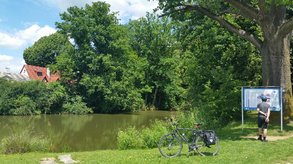 Hier machten wir eine Mittagspause mit Bad und Eis. Die Rückfahrt dehnten wir über Leutershausen und Obersulzbach aus, um den niedrigsten Punkt der Wasserscheide (460 m) oberen Altmühltal zu nutzen und bei Rückenwind gemütlich die Rezat hinunter zu radeln.