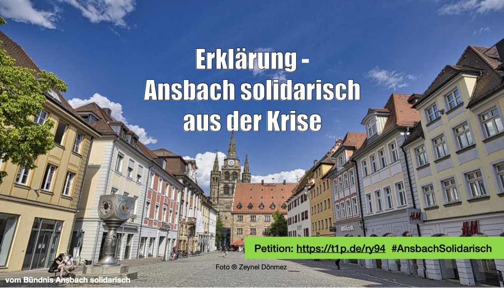 Die Proteste gegen die Corona-Maßnahmen in Ansbach und in Städten des Landkreises haben wir zum Anlass genommen, uns mit vielen anderen als Bündnis Ansbach solidarisch zu formieren. Die "Erklärung - Ansbach solidarisch aus der Krise“ eint uns in unserer Solidarität mit den Menschen, die besonders unter dieser Pandemie zu leiden haben, die im Gesundheitswesen, in den Sicherheitsbehörden und allen anderen Bereichen arbeiten.