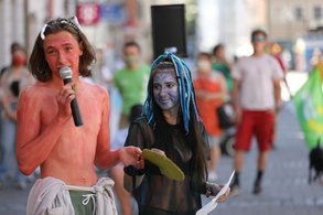 Ansbach/Grüne Jugend. Das Bunte Bündnis Ansbach hatte zu einer Fridays for Future-Kundgebung auf den Martin-Luther-Platz gerufen und 50-60 Menschen sind trotz Hitze und Covid-19-Gefahr gekommen. Ein Mikrofon fehlt? Die Grüne Jugend besorgt schnell noch eines und sicherheitshalber noch eine zweite Verstärkeranlage dazu.