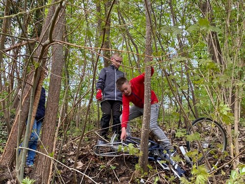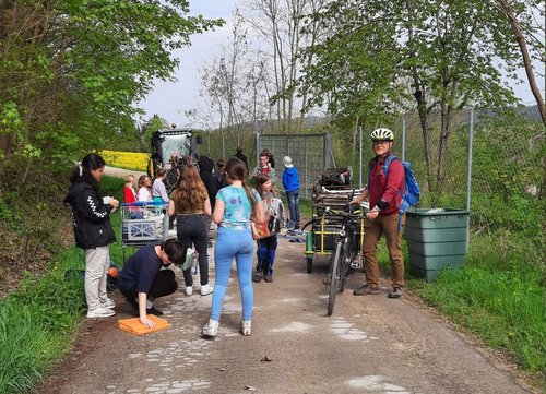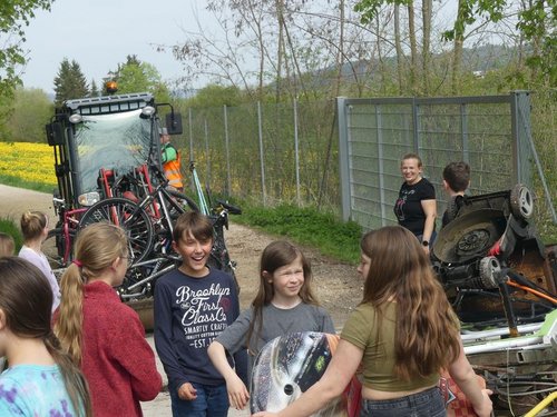 Verursacher waren wohl Vandalen, die auf der Deponie ihr Unwesen getrieben hatten und nicht das Betriebsamt selbst. Im Gegenteil: Ein zufällig mit einem Bagger vorbeikommender städtischer Mitarbeiter nahm den sammelnden Schülerinnen und Schülern der Montessori-Schule freundlicherweise gleich die Fahrradleichen und andere schwere Sachen ab. Mit vereinten Kräften wanderte dann auch ein Großteil der restlichen Müllmenge von einem guten Kubikmeter gleich auf die Deponie am Haldenweg.
