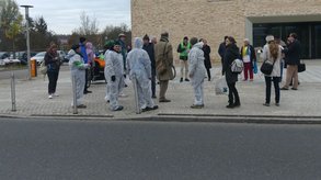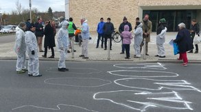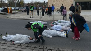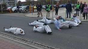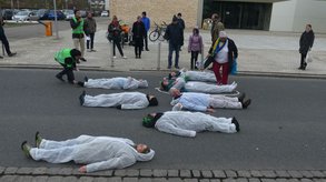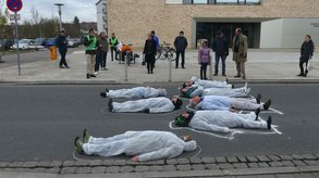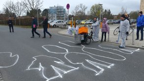 Ansbach. Vor dem Gebäude 54 der Hochschule begrüßten Meike Erbguth-Feldner und Dr. Bernhard Schmid die Teilnehmer und wiesen auf die hohe Fußgängerfrequenz zwischen den Campusteilen hin. Um die Gefahrenlage zu verdeutlichen und die Notwendigkeit eines Zebrastreifens im wahrsten Sinne des Wortes zu unterstreichen legten sich 7 weißgekleidete Menschen auf die Straße. Ihre Kontouren wurden mit weißer Kreide nachgezeichnet.