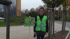 An der Schöneckerstraße angekommen wies der Co-Sprecher der Grünen Jugend, der Student Tobias Gaisser darauf hin, dass es im Südteil nur auf einer Seite einen Fußweg gäbe. Zudem würden viele Menschen an dieser Stelle in der Kurve zwischen Brückencenter und Mensa queren. Er stellte die Frage, ob da nicht Fußgänger-Piktogramme auf der Straße sinnvoll wären.