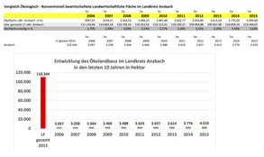 "Wir Grünen in Mittelfranken sehen in diesem Trend zur verstärkten Nachfrage nach heimischen Bio-Lebensmitteln eine große Chance, die es auch für die Mittelfränkische Landwirtschaft zu nutzen gilt." Leider übersteigt die Nachfrage seit Jahren das Angebot an regionalen Bio-Produkten. Im Vergleich mit den sieben bayerischen Bezirken ist Mittelfranken seit Jahren das Schlusslicht in Sachen "Ökolandbau". Während Bayernweit immerhin 7,2 Prozent der Fläche ökologisch bewirtschaftet werden, rangiert Mittelfranken weit abgeschlagen bei 4,3 Prozent. Das ist umso trauriger, wenn man weiß, dass Nürnberg Biomodellstadt ist. Wenig besser sieht es im Landkreis Ansbach aus. Der Anteil an Ökolandbau lag im Landkreis Ansbach im Jahr 2015 bei rund 4010 ha, was einen Anteil an der gesamten landwirtschaftlichen Nutzfläche von 3,63 % entspricht. Dies hat eine Schriftliche Anfrage des Grünen Landtagsabgeordneten Markus Ganserer ergeben.