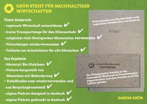 Verantwortung wahrnehmen! Das wollen wie GRÜNEN und wenn wir unseren Wahlkampf planen, dann achten wir auch immer darauf, unser Geld möglichst nachhaltig einzusetzen. Dabei gelten für uns neben ökologischen Standards auch soziale Standards. Es ist nicht immer leicht, die Informationen über Produkte und über Dienstleistungen zu bekommen, das müssen wir leider immer noch erfahren. Doch wir GRÜNEN in Stadt und Landkreis Ansbach strengen uns an einen (möglichst) ökologischen und nachhaltigen Wahlkampf zu führen. Wird sind immer motiviert, noch besser zu werden.
