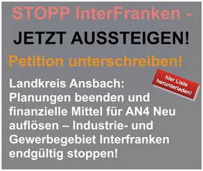 Der Vorstand des Kreisverbandes hat am 3.4.2015 beschlossen, die nachfolgende Petition gegen das Industrie- und Gewerbegebiet Interfranken zu starten. Diese Petition ist an die Mitglieder des Kreistages des Landkreis Ansbach, sowie den Landrat Dr. Jürgen Ludwig gerichtet.
