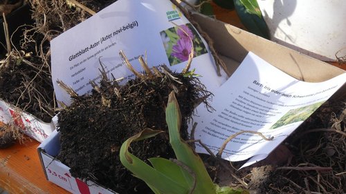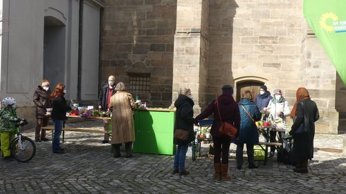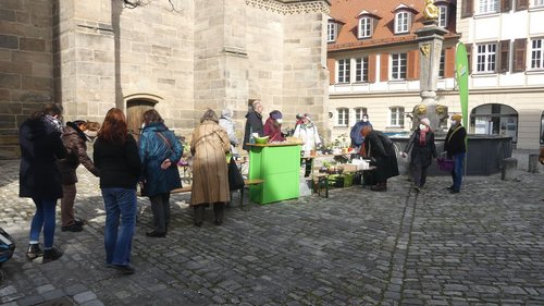 Bei strahlendem Sonnenschein, aber Temperaturen knapp über dem Gefrierpunkt herrschte reges Interesse. Fast alles fand eine:n Abnehmer:in und wurde in Zeitung, Karton oder Töpfchen verpackt weitergegeben.