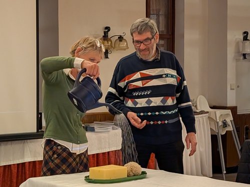 Foto 1: Camilla Ebert und Walter Würfel von der Ortsgruppe Rothenburg Bund Naturschutz präsentieren ein Schwammstadt Modell im übertragenen Sinn bei der Begrüßung.