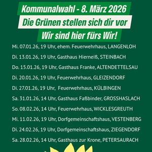 17.01.26 - Unser Wahlflyer zur Kommunalwahl 2026 ist fertig! Hier stellen sich alle 20 Stadtratskandidat:innen und die Bürgermeisterkandidatin vor. Schwerpunkte des Programms sind das soziale Miteinander, Mobilität und Dorfentwicklung, Klimaschutz vor Ort sowie Kultur und Lebensqualität. Hier gehts zum Flyer Mehr