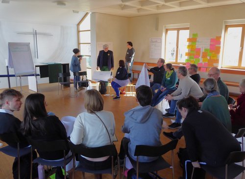 Im Gemeindehaus in Hennenbach ging es neben der Gewinnung von neuen Mitgliedern auch um die Motivation von bereits aktiven Grünen. Zuerst wurde gemeinsame Bestandsaufnahme gemacht, was an den Grünen jetzt attraktiv ist, bevor Wünsche für die Zukunft zu diesem Punkt gesammelt wurden. Dann ging es in Arbeitsgruppen um die Frage der Sichtbarkeit, die u. a. entscheidend für die Gewinnung von neuen Mitgliedern ist. Und schließlich beschäftigten wir uns noch mit den notwendigen Strukturen für eine erfolgreiche Arbeit und deren "Vermarktung".
