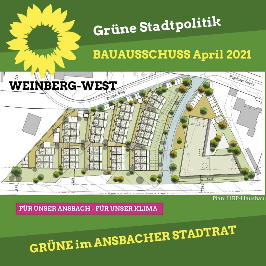 Stadtrat/Ansbach. Der Bau- und Werkausschusses des Ansbacher Stadtrats hat sich in seiner Sitzung vom 19. April 2021 mit der Weiterführung des Verfahrens des vorhabenbezogenen Bebauungsplans Weinberg-West befasst. Konkret ging es um einen Grundsatzbeschluss zum Bebauungsplan. Im Ansbacher Norden soll auf einer kleinen Fläche am Strühterhang ein Wohngebiet und eine Pflegeeinrichtung entstehen. Wir Grünen drängten im Ausschuss auf eine Anpassung der bisherigen Planung.