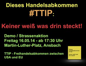 ANSBACH. Am Freitag Spätnachmittag, den 16.05.2014, ludt die Kreisgruppe Ansbach des Bund Naturschutz e.V gemeinsam mit uns Ansbacher Grünen zur Demo gehen das geplante Freihandelsabkommen TTIP ein. Trotz der sehr kurzfristig angesetzten Demo kamen über 60 Personen auf den Martin-Luther-Platz nach Ansbach um gemeinsam ein Zeichen gegen TTIP zu setzen.